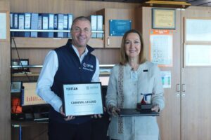 Durante la ceremonia de bienvenida se llevó a cabo el tradicional intercambio de placas conmemorativas entre representantes de la naviera y autoridades estatales, portuarias y municipales, como símbolo de amistad, cooperación y fortalecimiento de los lazos entre Yucatán y Carnival Cruise Line.