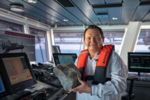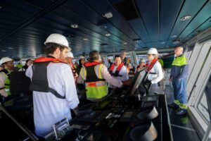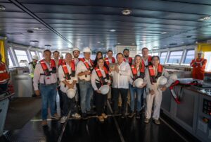 El Gobernador y la comitiva recorrieron las instalaciones del buque, incluyendo el centro de control, el cuarto de máquinas y el sistema de bombeo, donde constataron el funcionamiento del proceso mediante el cual se extrae y traslada el material rocoso del fondo marino fuera del canal de navegación.
