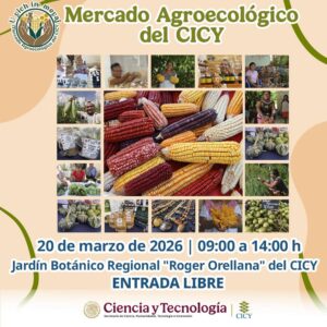 Con el objetivo de fortalecer los sistemas alimentarios locales, promover la producción sustentable y fomentar hábitos de consumo responsables, el Centro de Investigación Científica de Yucatán (CICY) invita al público en general a participar en el Mercado Agroecológico “U yich in meyaj” (el fruto de nuestro trabajo), que se llevará a cabo el próximo 20 de marzo de 2026, en un horario de 09:00 a 14:00 horas, en el Jardín Botánico Regional “Roger Orellana” del CICY.